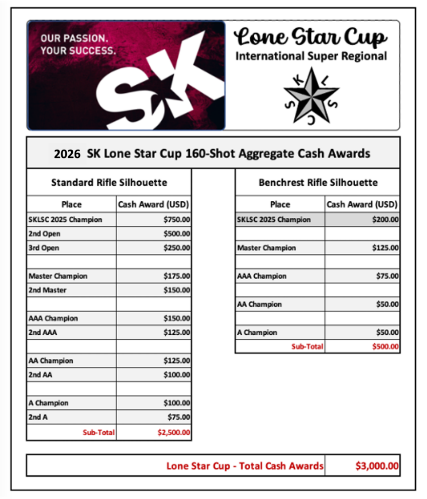 - Match 8 – El “Trofeo de Campeón SK Lone Star Cup” para el Ganador de la Clase Open Agregado (160 tiros), así como trofeos de 2º Open y 3º Open . También se entregarán medallas de la clase Agregada del1º al5º puesto en las clasificaciones Master, AAA, AA, A y B.