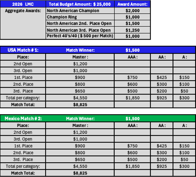 Your Lapua Monarch Cup Board of Directors has finalized the 2026 Lapua Monarch Cup Cash Awards for the USA Stage 1 and Mexico Stage 2 matches and the Grand Aggregate as shown in the table to the left. So come join us for this World Class Event!